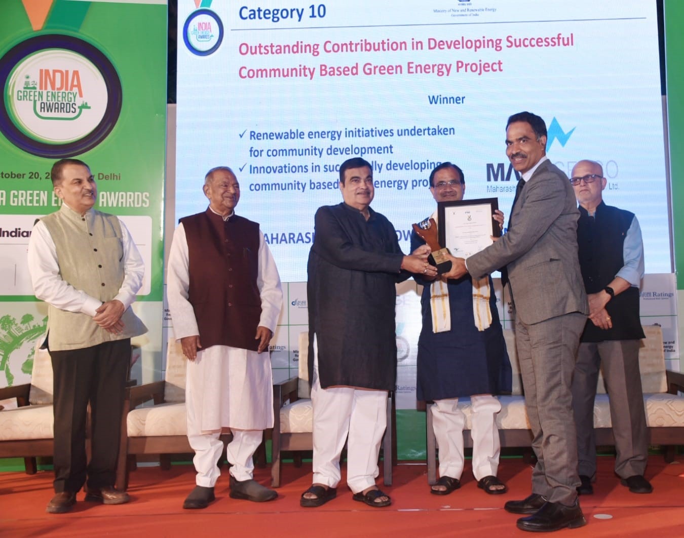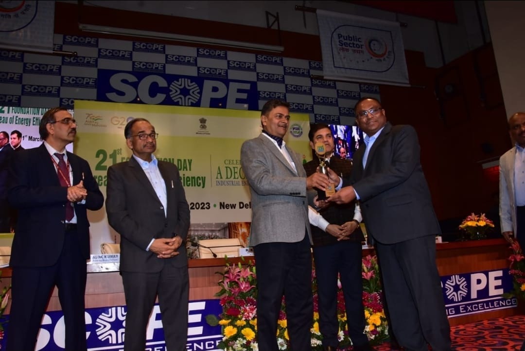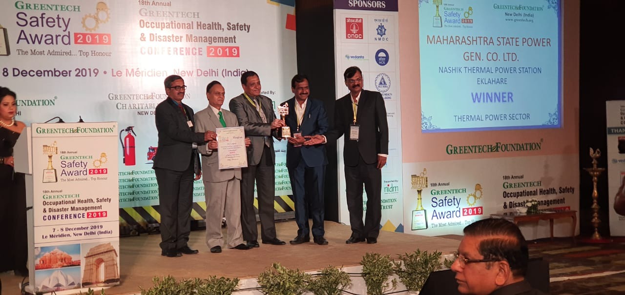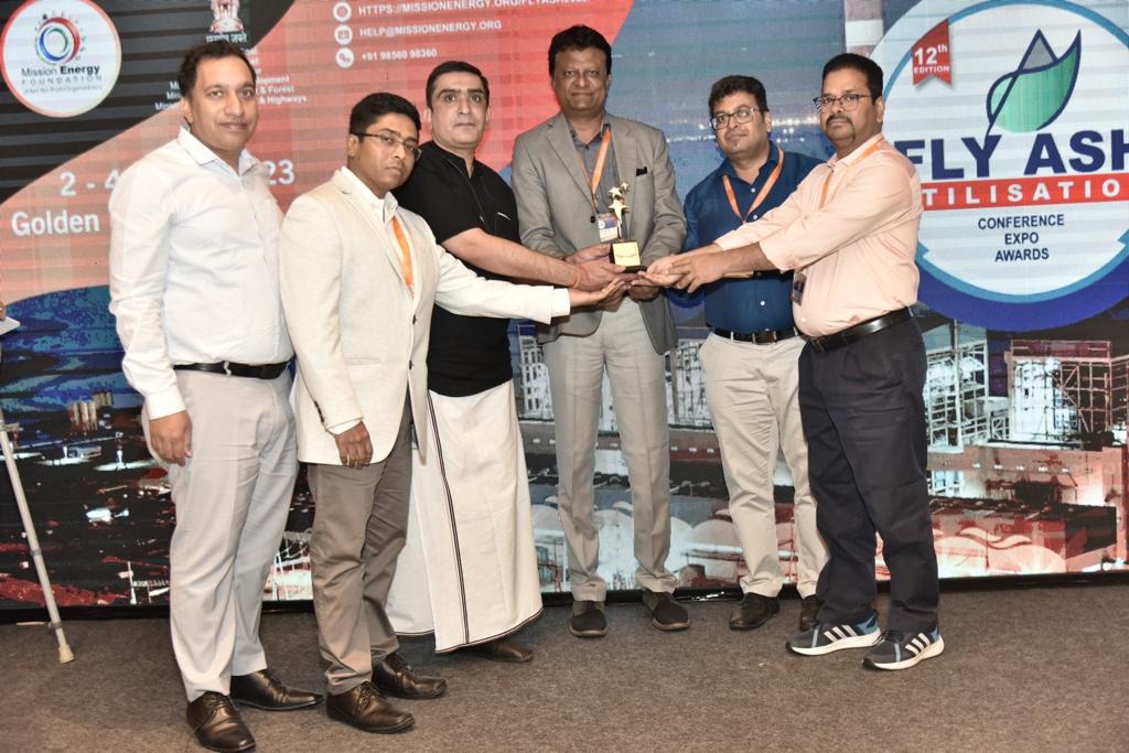 Dr. Nitin Wagh, ED(E&S), receiving two awards on behalf of Mahagenco from Mr. Ashwinkumar Khatri, Director General of Mission Energy Foundation, during the Fly Ash Utilization Conference Expo Awards 2023 at Golden Tulip Resort, Goa. Also present were Mr. Shailesh Padol, COO, Mr. Pankaj Sharma, CGM(Finance), Mr. Nandal, EE(E&S), and Mr. Kinake, EE(E&S)