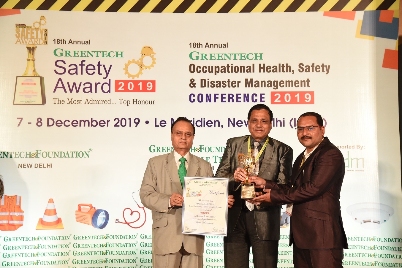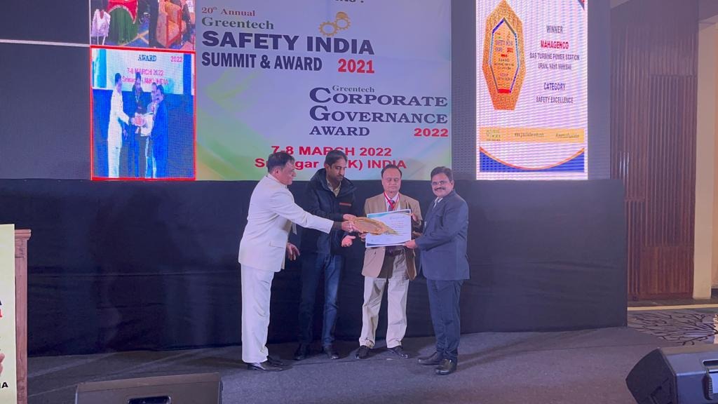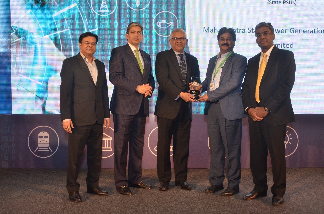 Dr. Nitin Wagh, ED(E&S), receiving two awards on behalf of Mahagenco from Mr. Ashwinkumar Khatri, Director General of Mission Energy Foundation, during the Fly Ash Utilization Conference Expo Awards 2023 at Golden Tulip Resort, Goa. Also present were Mr. Shailesh Padol, COO, Mr. Pankaj Sharma, CGM(Finance), Mr. Nandal, EE(E&S), and Mr. Kinake, EE(E&S)